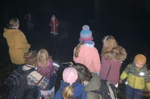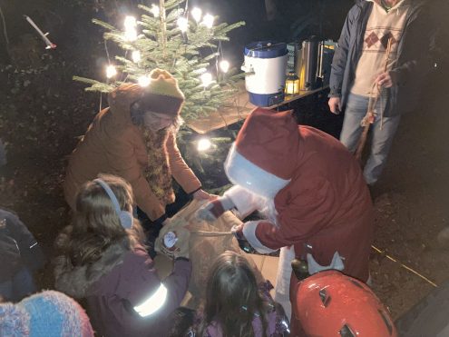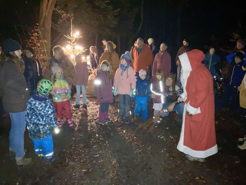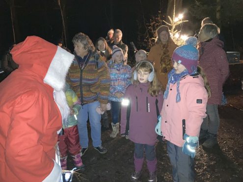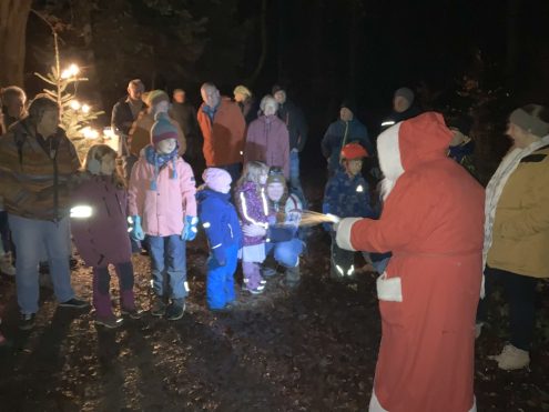 Mit Trompetenbegleitung durch Wolfgang Stober sangen die Wanderer erstmal zwei Weihnachtslieder und dann kam auch schon der Nikolaus aus dem dunklen Wald heraus.