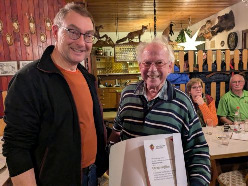 Günther Zehelein ist seit 35 Jahren Mitglied im Schwäbischen Albverein. Seit 1998 bis heute ist er im Ausschuss aktiv, von 1998 – 2014 hatte er das Amt des Wegewart inne. Mittlerweile 90 Jahre alt, kümmert er sich immer noch liebevoll um den Schaukasten am alten Schulhaus in Grab und besucht zusammen mit seiner Frau Christel alle Veranstaltungen im Ort.